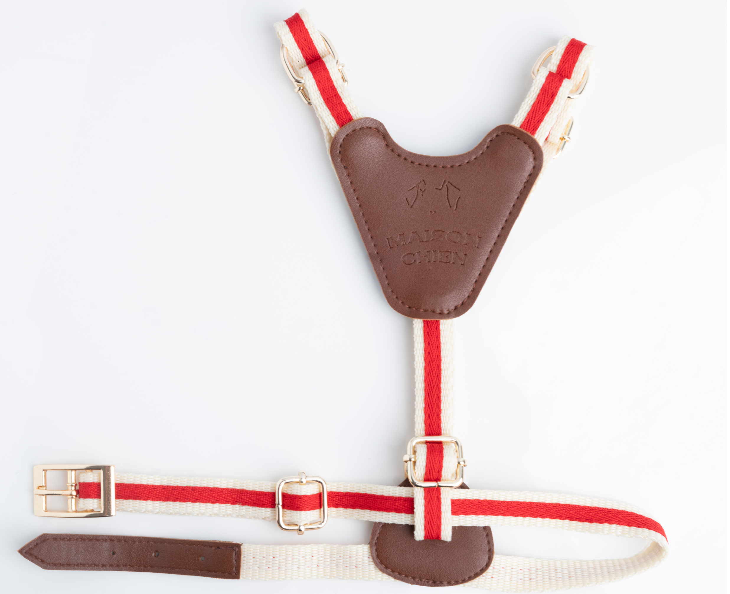 Unleash a new dimension of comfort and safety with our Maison Chien harness. Our proprietary triple-point buckle system provides all around adjustability and offers a completely tailored fit.